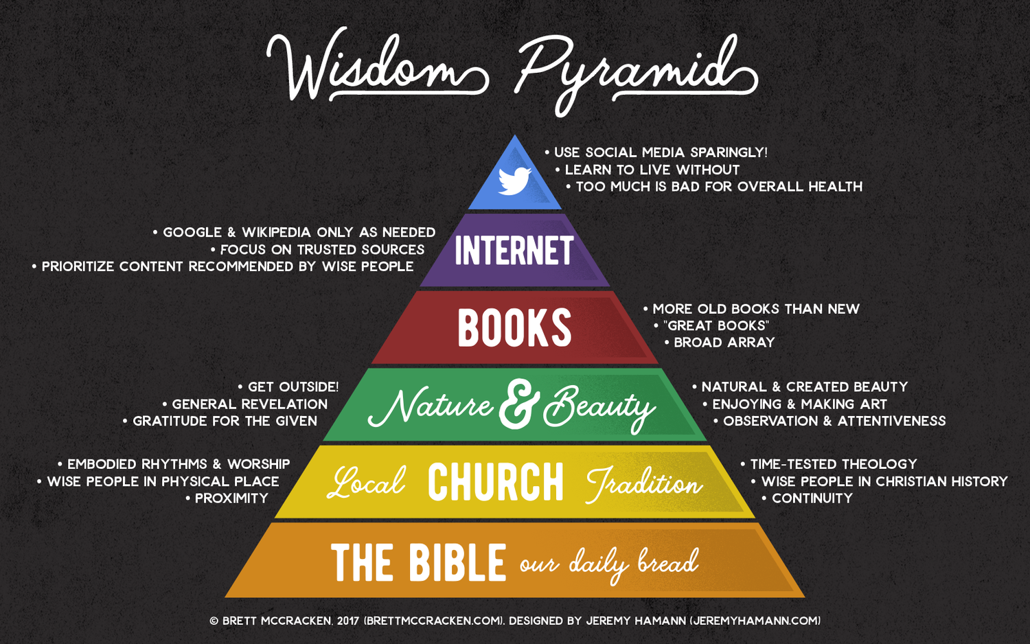 This past Sunday I preached on what we let disciple us, and shared a suggestion from Brett McCracken on the Wisdom Pyramid. It’s a helpful guide on what we consume and allow to shape us. I also share the various podcasts I listen to, and the books and music I’ve been enjoying the past week! Here’s the whole list: